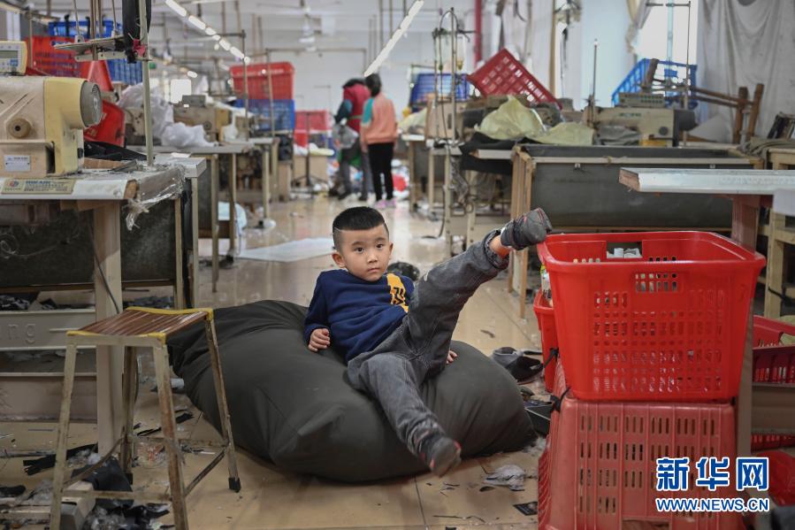 1月26日,在福建省石狮市的金利莱斯服装厂,聪聪坐在准备寄回老家的礼物布袋上玩耍。
