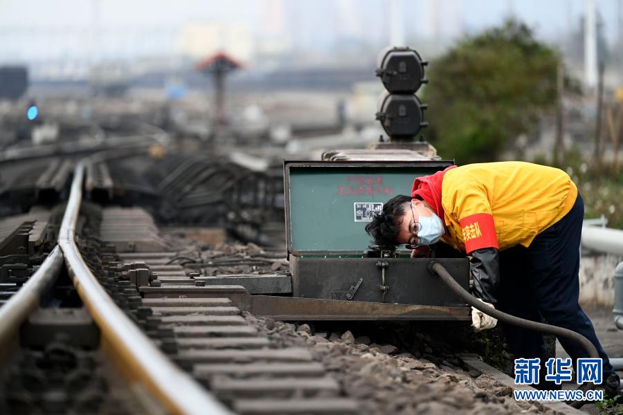 2月2日,在广西柳州南编组站驼峰场,柳州电务段柳州南三场驼峰工区的工人在站场上作业。新华社发(黎寒池 摄)