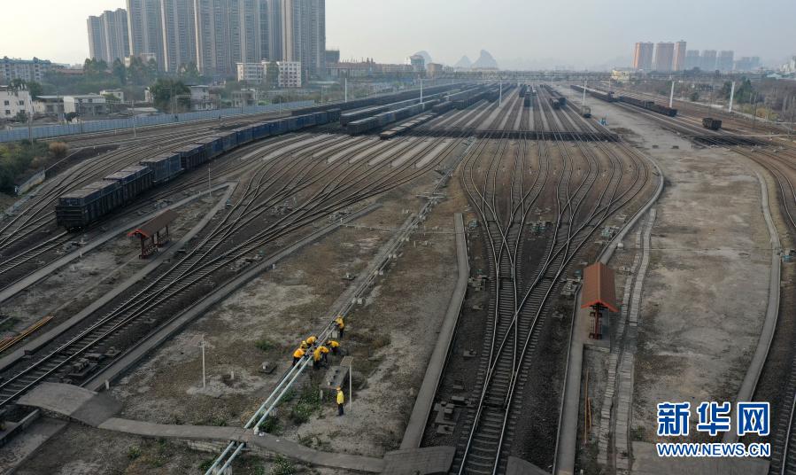 2月2日,在广西柳州南编组站驼峰场,柳州电务段柳州南三场缓行器工区工人在站场上给风管刷油漆(无人机照片)。新华社发(黎寒池 摄)