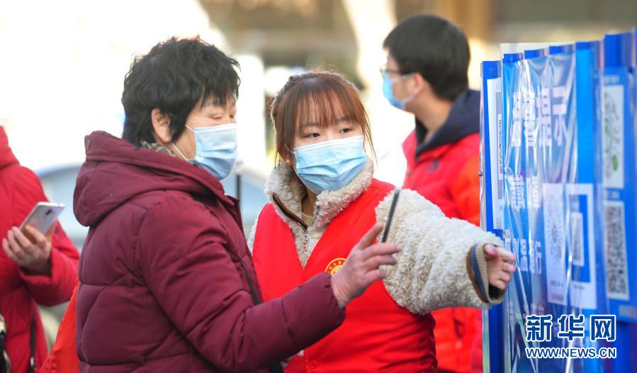 2月2日,志愿者在沧州市新华区欣怡小区引导市民扫描健康行程码。新华社发(苑立伟 摄)