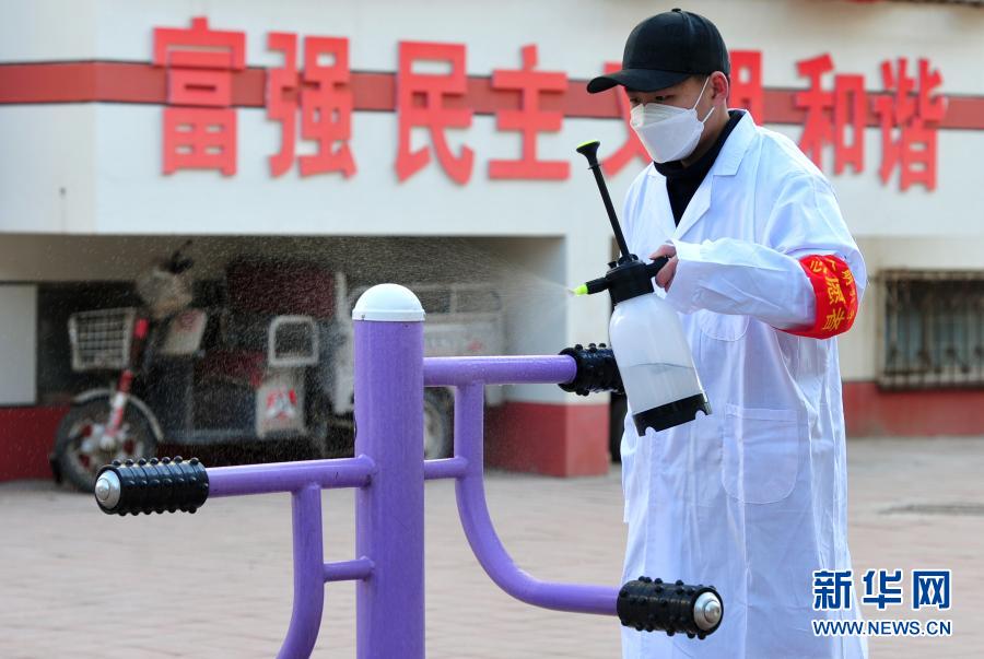 2月2日,志愿者在沧州市新华区欣怡小区对公共健身设施进行消毒。新华社发(苑立伟 摄)