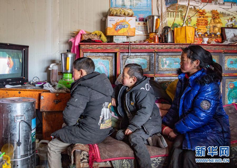 藏北纳木错乡恰嘎村牧民定居点的孩子们在看电视(1月29日摄)。