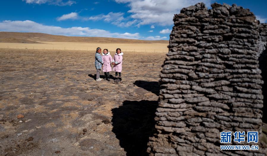藏北纳木错乡恰嘎村的孩子们在牛粪墙边玩耍(1月29日摄)。新华社记者 普布扎西 摄