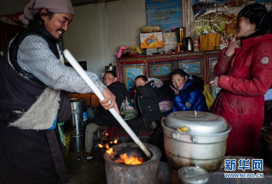 藏北纳木错乡恰嘎村的牧民丹增洛桑一家围坐在冬季定居点内烧茶(1月29日摄)。新华社记者 普布扎西 摄