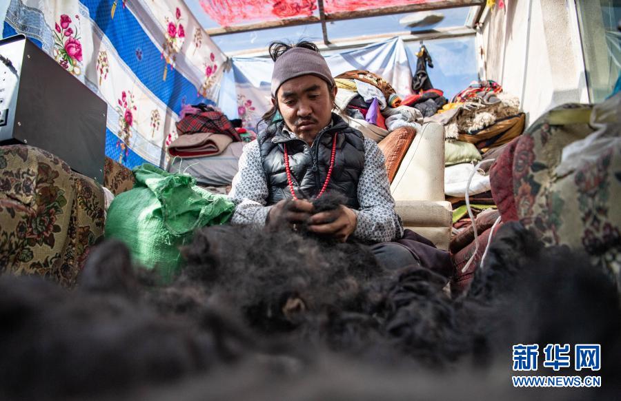 藏北纳木错乡恰嘎村的牧民丹增洛桑在冬季定居点捻牛毛,准备用于制作帐篷(1月29日摄)。新华社记者 晋美多吉 摄