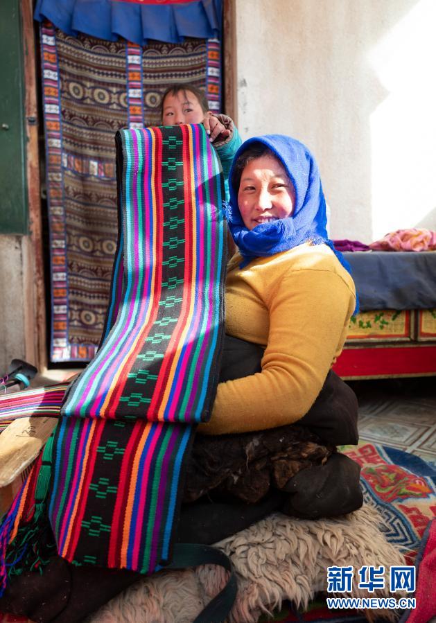 藏北纳木错乡恰嘎村的牧民旦珍在家里展示编织的氆氇(1月29日摄)。新华社记者 孙非 摄