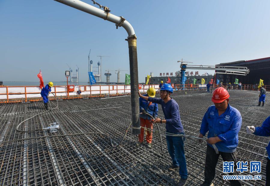 2月2日,施工人员在中铁大桥局深中通道项目智慧梁场进行首榀60米混凝土箱梁浇筑。新华社记者 刘大伟 摄