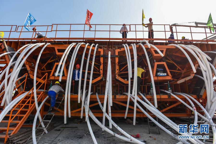 2月2日,施工人员在中铁大桥局深中通道项目智慧梁场进行首榀60米混凝土箱梁浇筑。新华社记者 刘大伟 摄