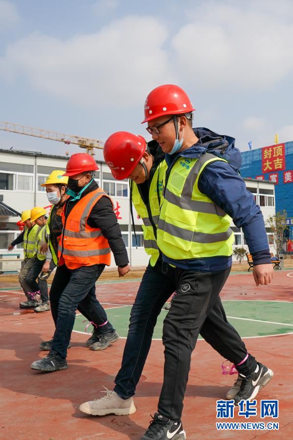 2月2日,外来务工人员在项目工地体验两人三足游戏。