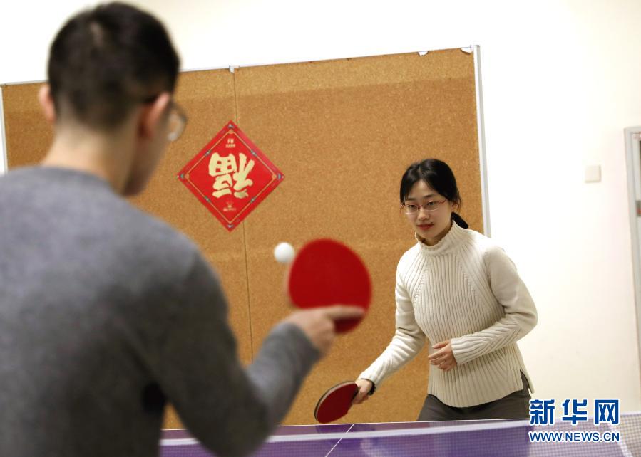 2月2日,家在辽宁的上海交通大学机械与动力工程学院博士研究生赵林川(右)与其他留校同学一起打乒乓球。