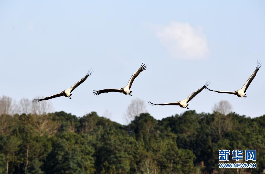 2月1日,黑颈鹤在贵州草海上空飞翔。