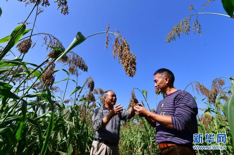 在百朋镇小山村,当地农业专家(左)在红高粱地指导村民管护(2020年10月23日摄)。新华社记者 黄孝邦 摄
