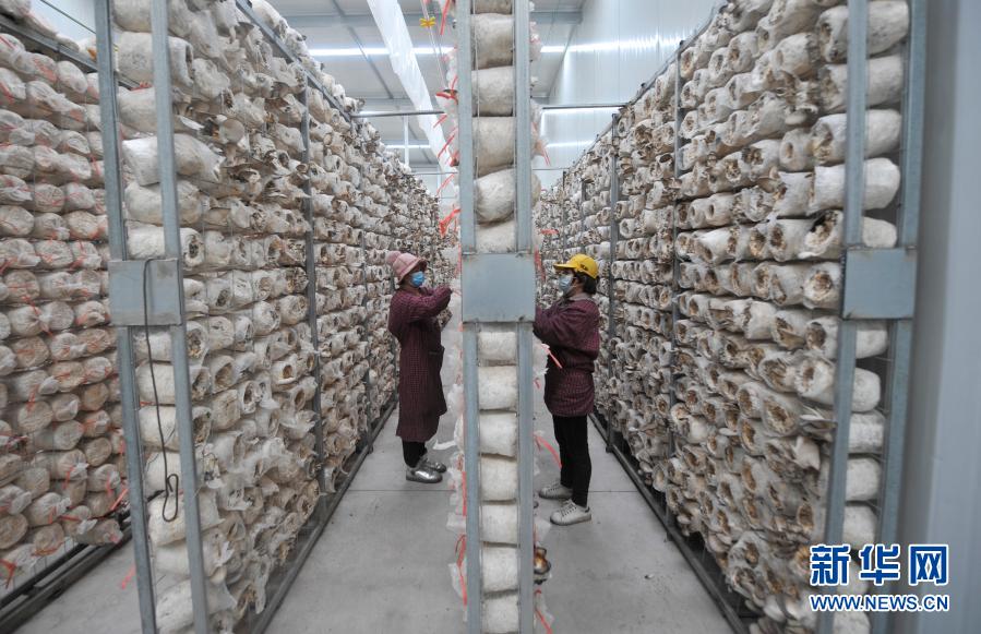 2月2日,在滦平县付营子镇“微型菇房”,工作人员在整理菌棒。新华社发(王立群 摄)