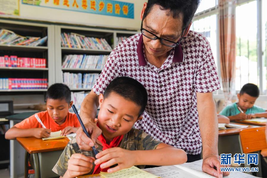 在广西武宣县二塘镇双桂小学,乡村教师韦旭禧纠正学生握笔姿势(2020年6月19日摄)。新华社记者 曹祎铭 摄