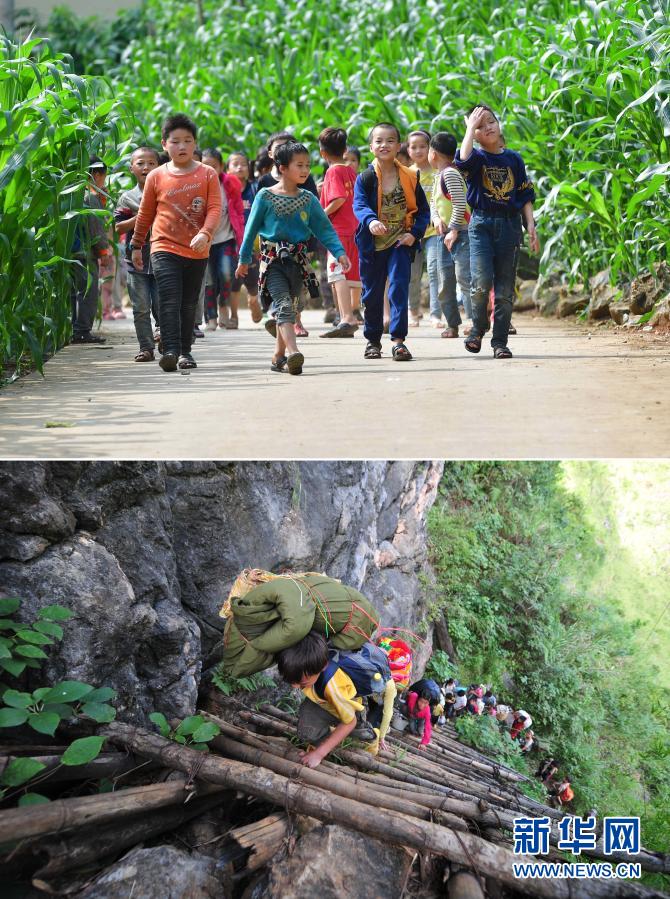 拼版照片:上图为在广西大化瑶族自治县板升乡弄勇村,孩子们走在放学路上(2019年5月10日摄);下图为在弄勇村弄顶屯,孩子们扛着生活用具,爬悬梯回家(2012年7月4日摄)。目前,弄勇村所有的屯都已告别没有公路的历史。新华社记者 黄孝邦 摄