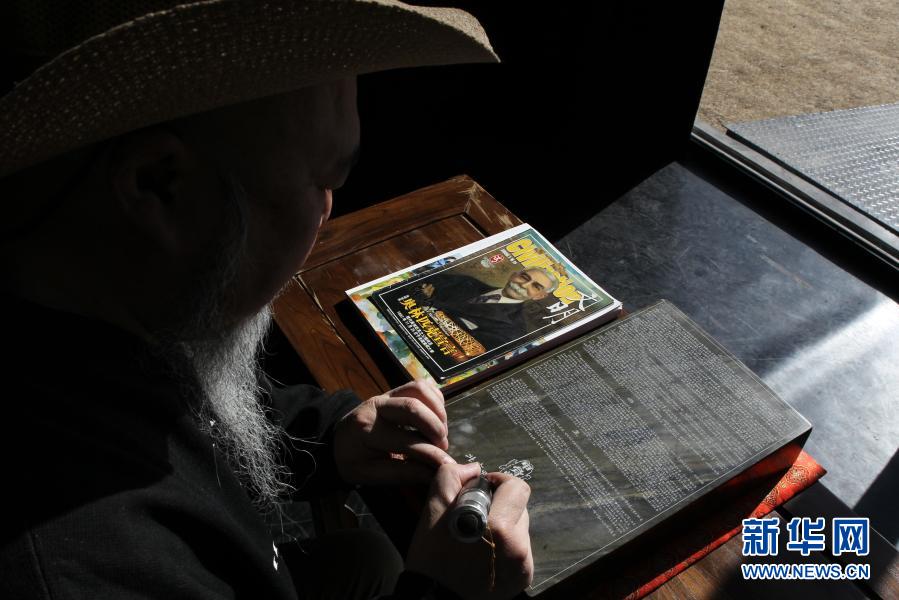 2月2日,申建华在北京欧林乌托邦艺术空间创作《奥林匹克宣言》石刻作品。新华社记者 侯俊 摄