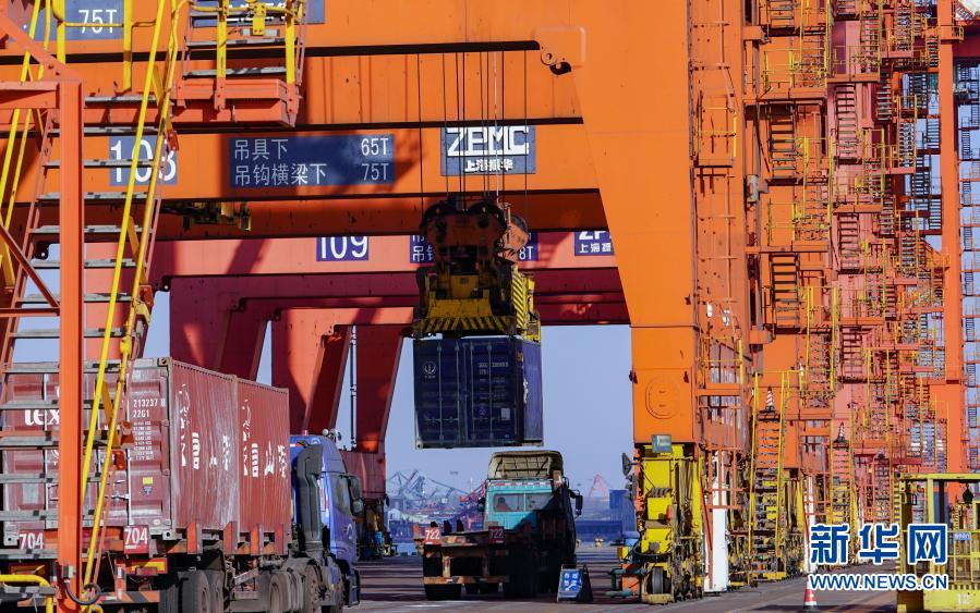 2月2日,工人在唐山港京唐港区集装箱码头操作机械设备吊运集装箱。