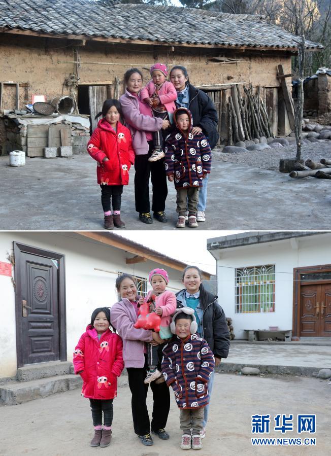 1月22日,巴木玉布木和孩子们在曾经住过的房屋(上图)和新建的房子门口(下图)合影(拼版照片)。新华社记者 周科 摄