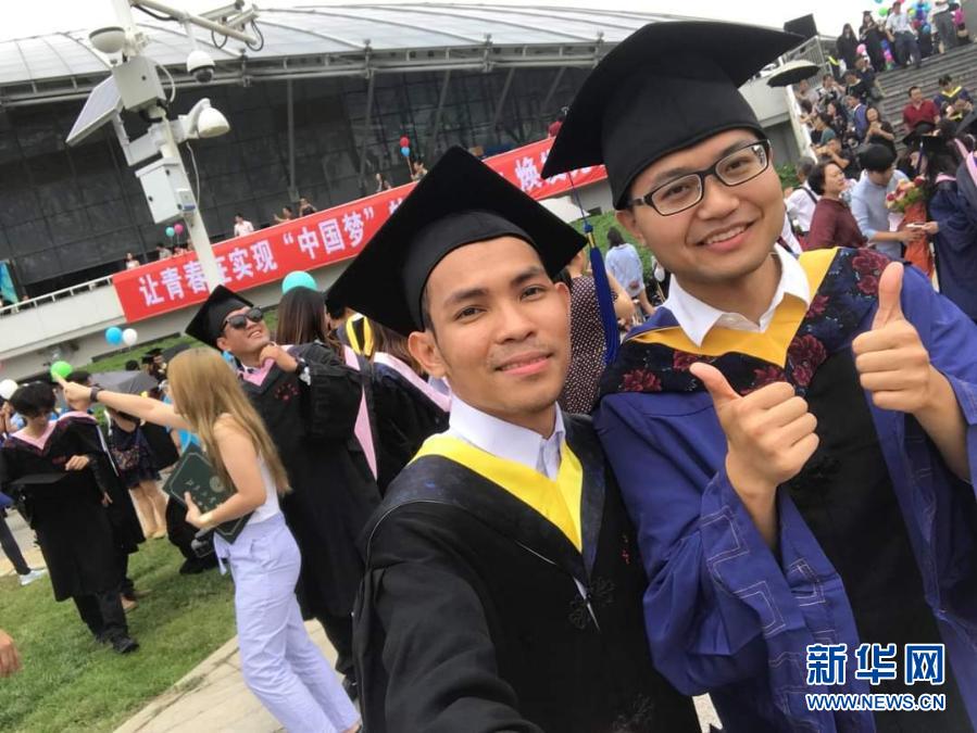 这是2018年7月10日,达多(左)从北京工业大学毕业时和同学在校园内合影留念。新华社发(受访对象提供)