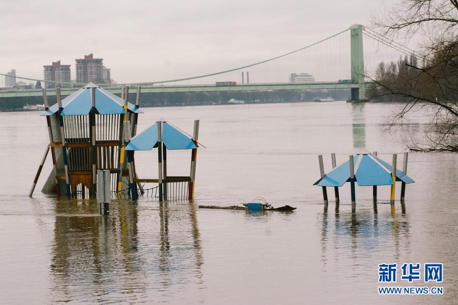 这张2月2日在德国科隆拍摄的照片显示,位于莱茵河岸边的儿童健身设施被部分淹没在上涨的河水中。近日,连续降雨天气导致德国科隆莱茵河水位上涨。新华社发(唐颖 摄)