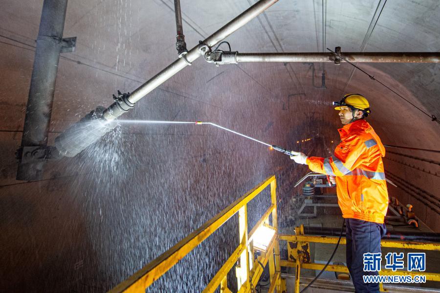 2月3日,维修工李磊在宁杭高铁一处隧道内进行接触网绝缘子清洗作业。新华社发(江汉摄)