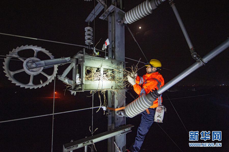 2月3日,维修工李磊在清理接触网上的鸟巢。鸟巢在阴雨天受潮后容易导电,极易引发接触网短路。新华社发(江汉摄)
