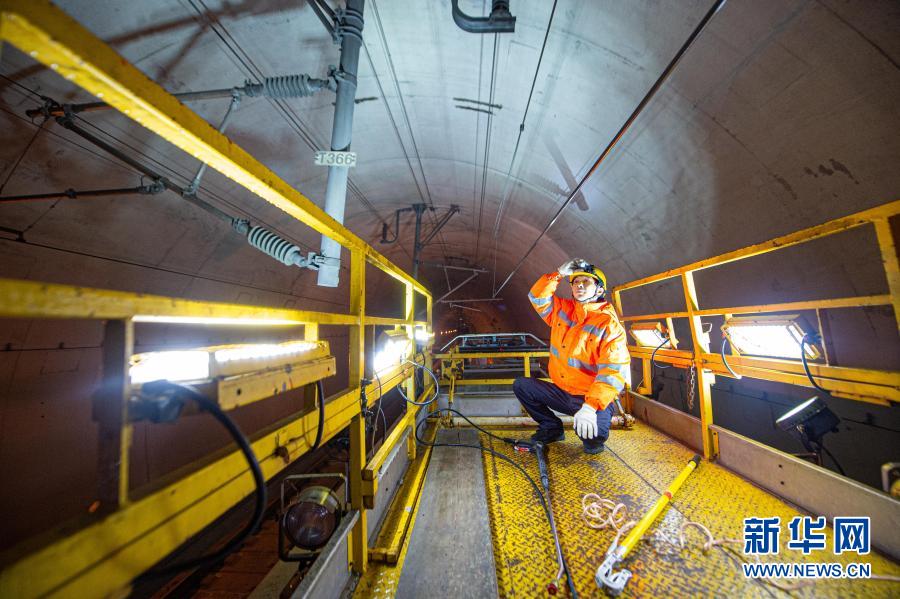 2月3日,在检查作业车的作业平台上,维修工李磊在观察隧道内的接触网情况。新华社发(江汉摄)