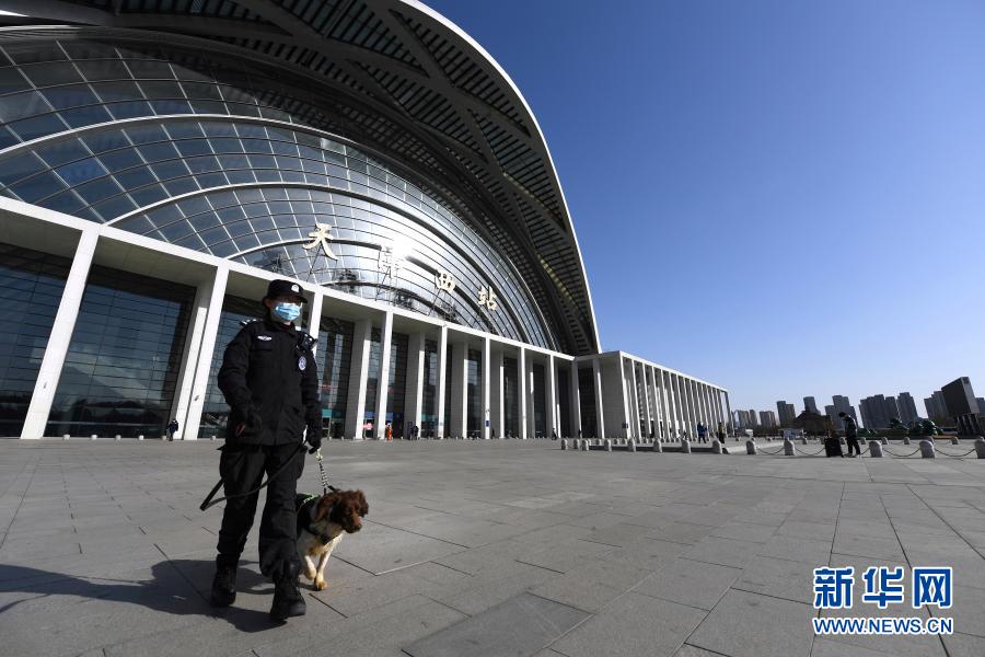 2月1日,警犬训导员韩朝阳和警犬“追风”在天津西站值守巡逻(2月1日摄)。