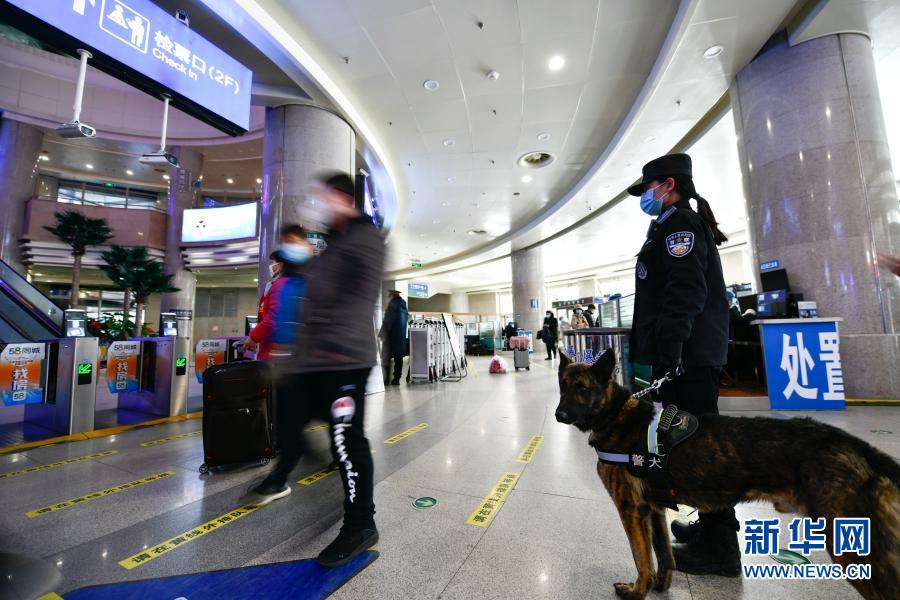 训导员赵晖携护卫犬“芬迪”在天津站检票口处执勤(2月1日摄)。