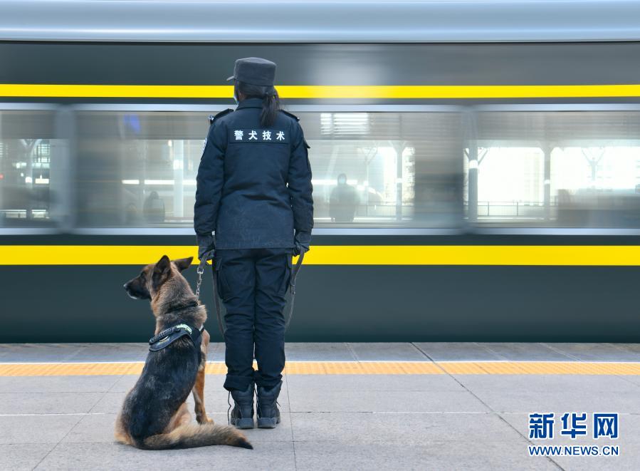 训导员王吉携护卫犬“茶茶”在天津站站台执勤(2月1日摄)。
