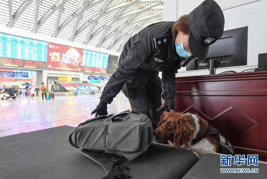2月1日,警犬“追风”在警犬训导员韩朝阳的指导下排查旅客行李(2月1日摄)。