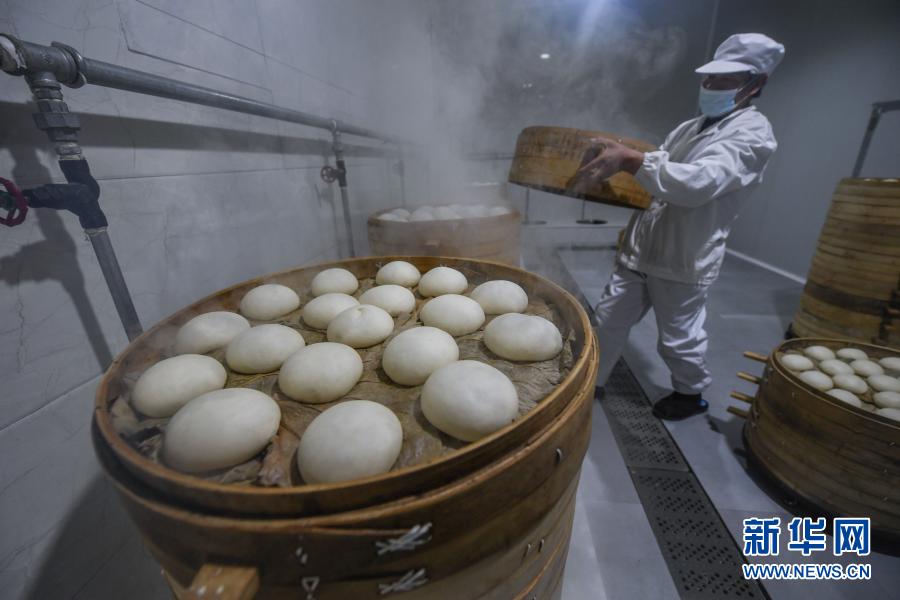 2月3日,仁智村馒头产业园的生产车间内,工人在蒸酒酿馒头。