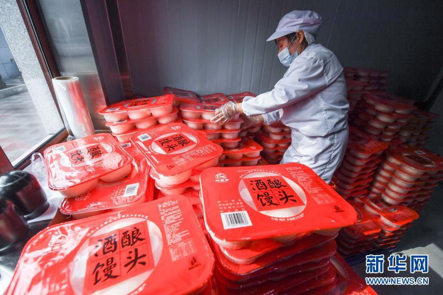 2月3日,仁智村馒头产业园的生产车间内,工人在码放包装好的酒酿馒头。