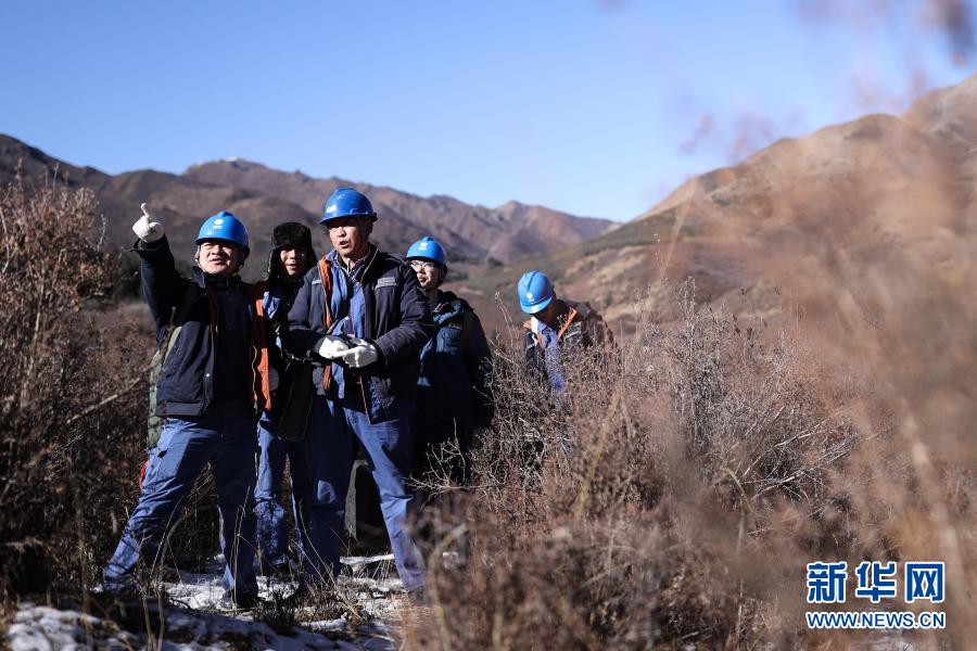 2月2日,国家电网青海检修公司民和运维分部输电三班班长劳朕(左一)和班组成员在巡线途中查看线路。