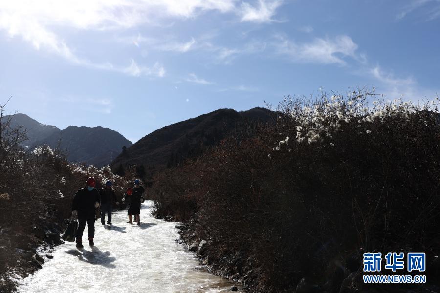 2月2日,国家电网青海检修公司民和运维分部输电三班的成员在巡线途中穿过结冰路面。新华社记者 吴刚 摄