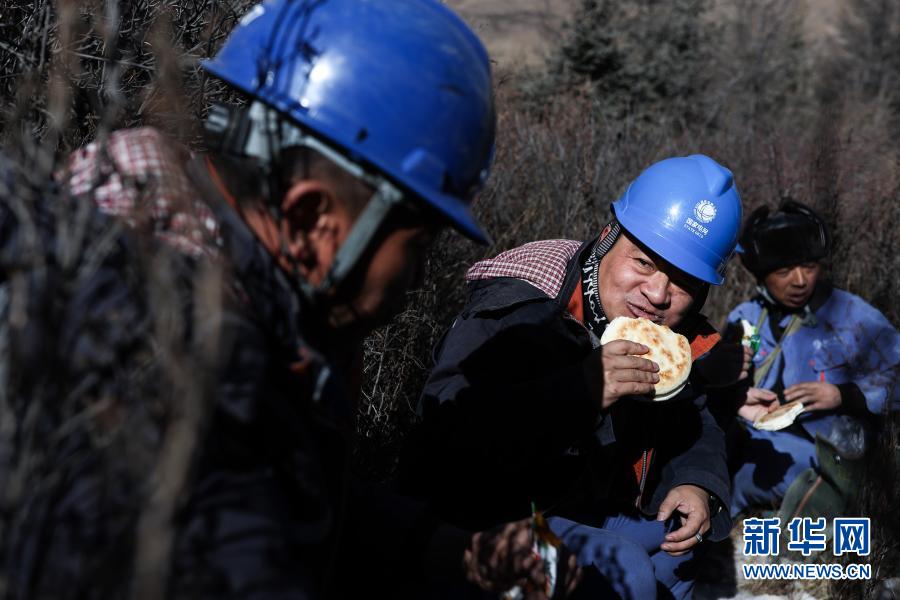 2月2日,国家电网青海检修公司民和运维分部输电三班班长劳朕(中)和班组成员在巡线途中吃午饭。新华社记者 吴刚 摄