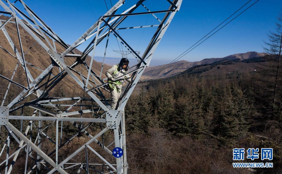 2月2日,国家电网青海检修公司民和运维分部输电三班的田世沛在塔架上查看病害情况(无人机照片)。新华社记者 吴刚 摄