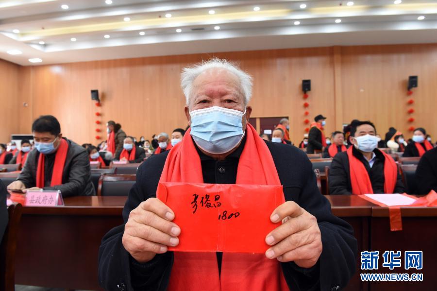 2月3日,在凤阳县小岗村,“大包干”带头人严俊昌展示自家领取的分红红包。