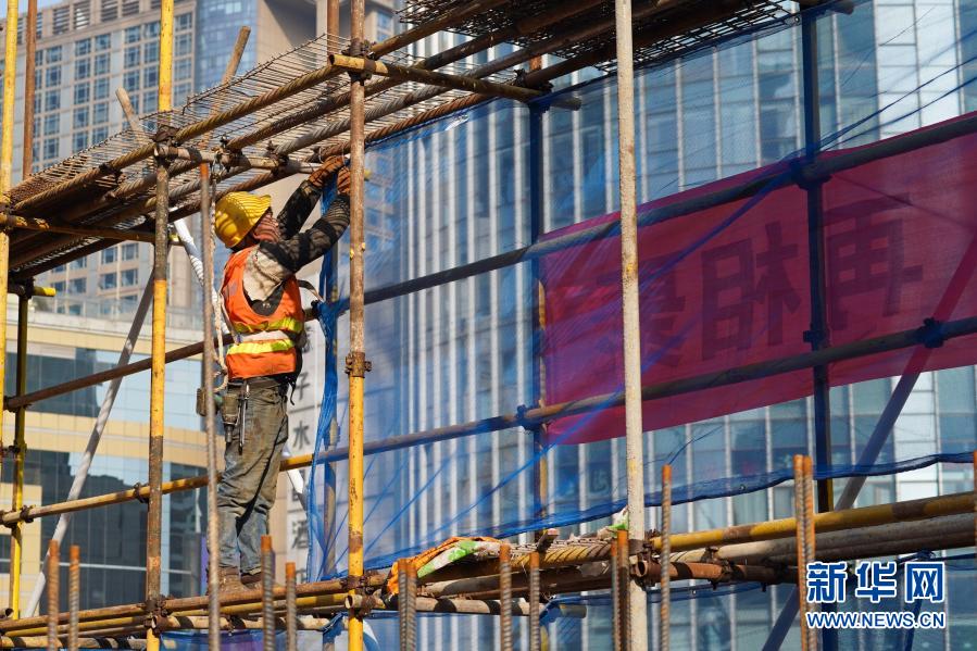 2月3日,中建三局一公司的工程人员在南京金陵中环项目施工现场进行外架搭设作业。