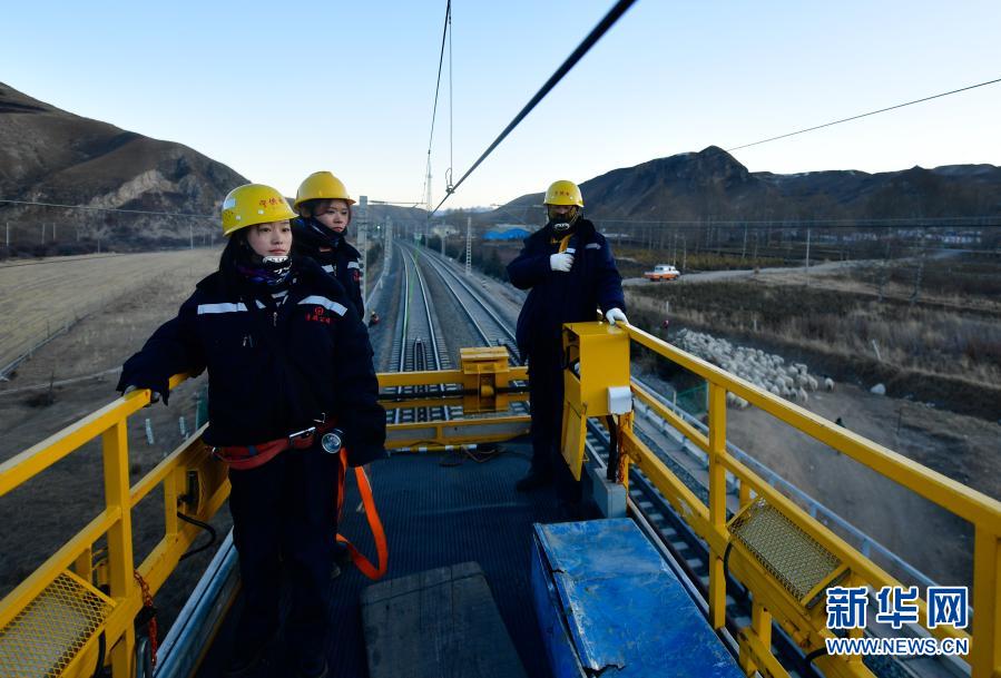 2月2日,在青藏铁路公司西宁供电段哈尔盖工区负责铁路线上,郭胜强(左一)与罗露露(左二)在高空作业平台上准备工作。