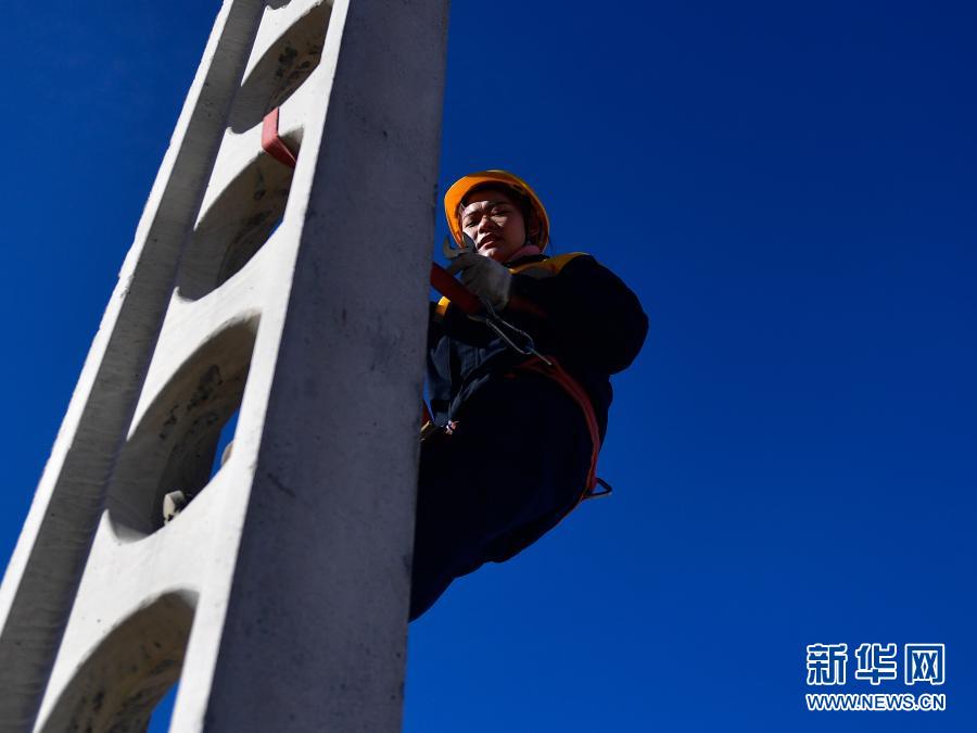 2月2日,在青藏铁路公司西宁供电段哈尔盖工区负责铁路线上,罗露露在攀登接触网支柱。