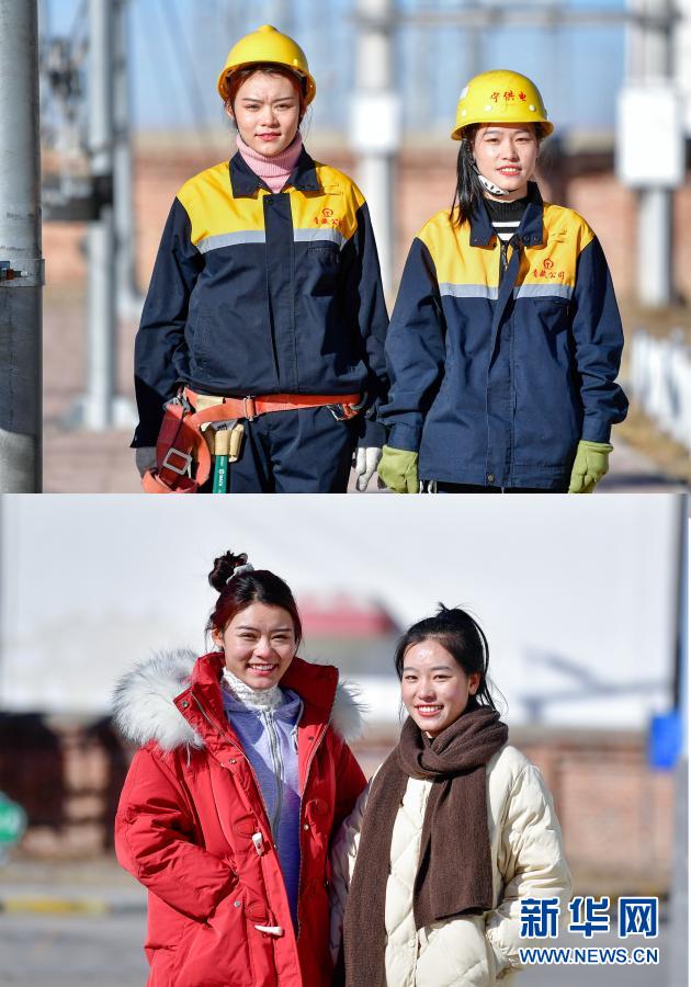 这是一张拼版照片,上图为:罗露露(左)与郭胜强在工作前拍摄的合影(2月2日摄);下图为:罗露露(左)与郭胜强在休息时拍摄的合影(2月2日摄)。
