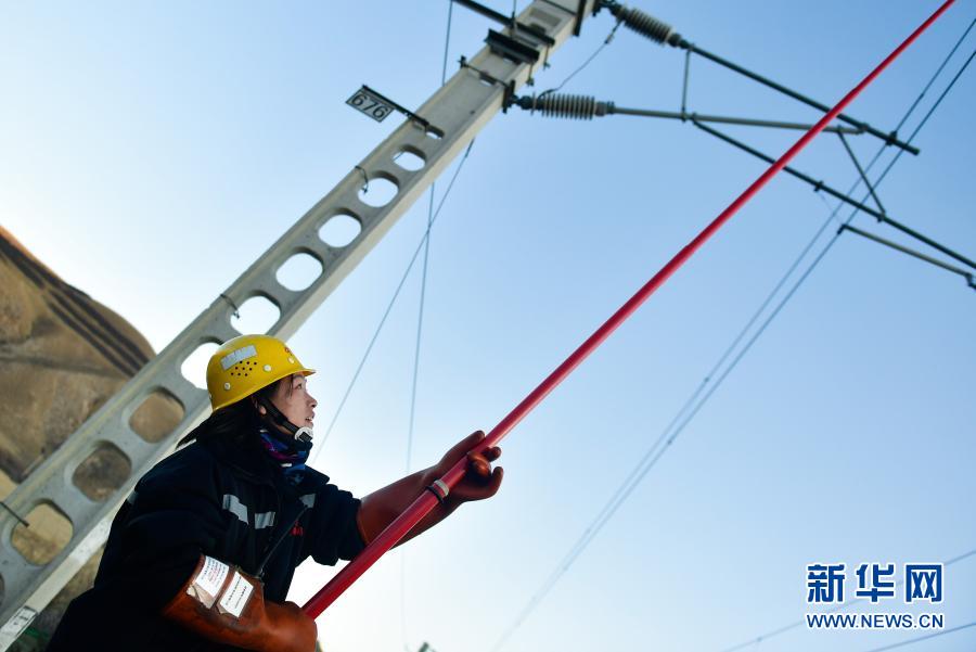 2月2日,在青藏铁路公司西宁供电段哈尔盖工区负责铁路线上,郭胜强在挂地线。