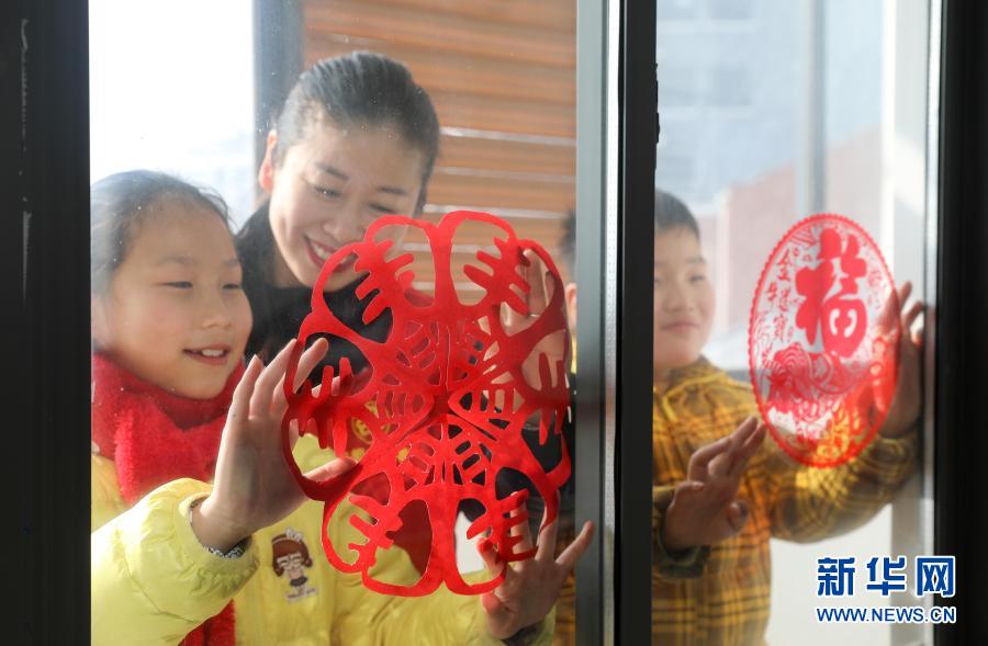 2月3日,志愿者和孩子们一起贴窗花。新华社记者 曹力 摄