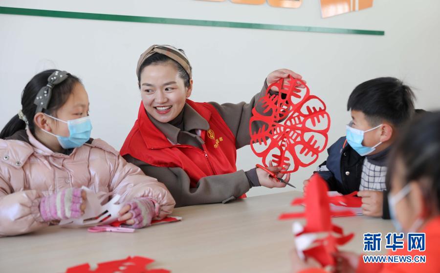 2月3日,志愿者教孩子们剪纸。新华社记者 曹力 摄