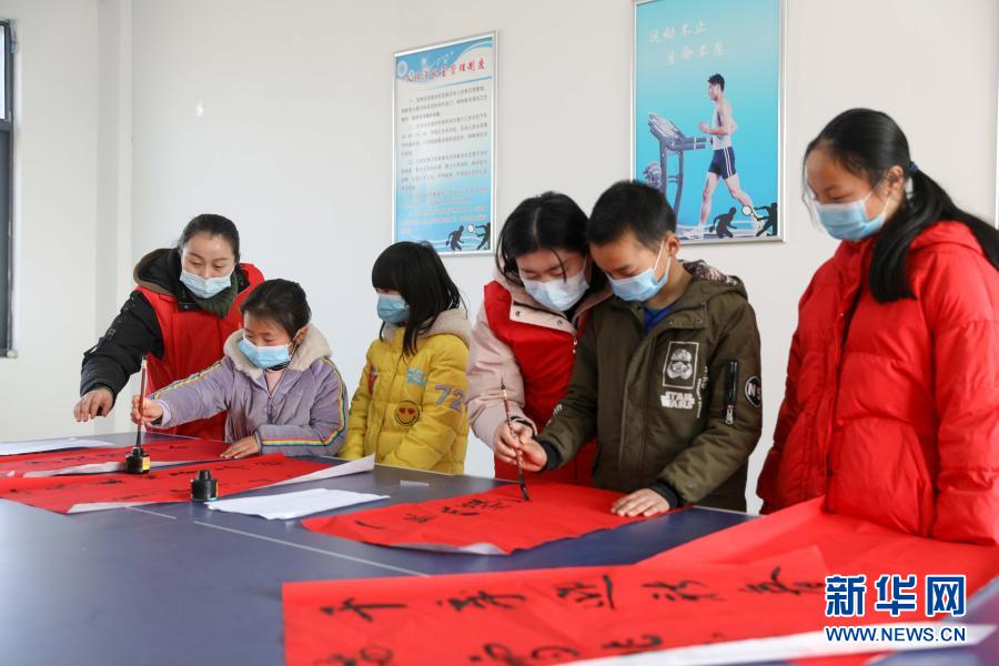 2月3日,志愿者教孩子们写春联。新华社记者 曹力 摄