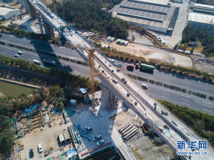 这是位于福建省厦门市的新建福厦铁路西溪特大桥跨沈海高速连续梁(2月3日摄,无人机照片)。