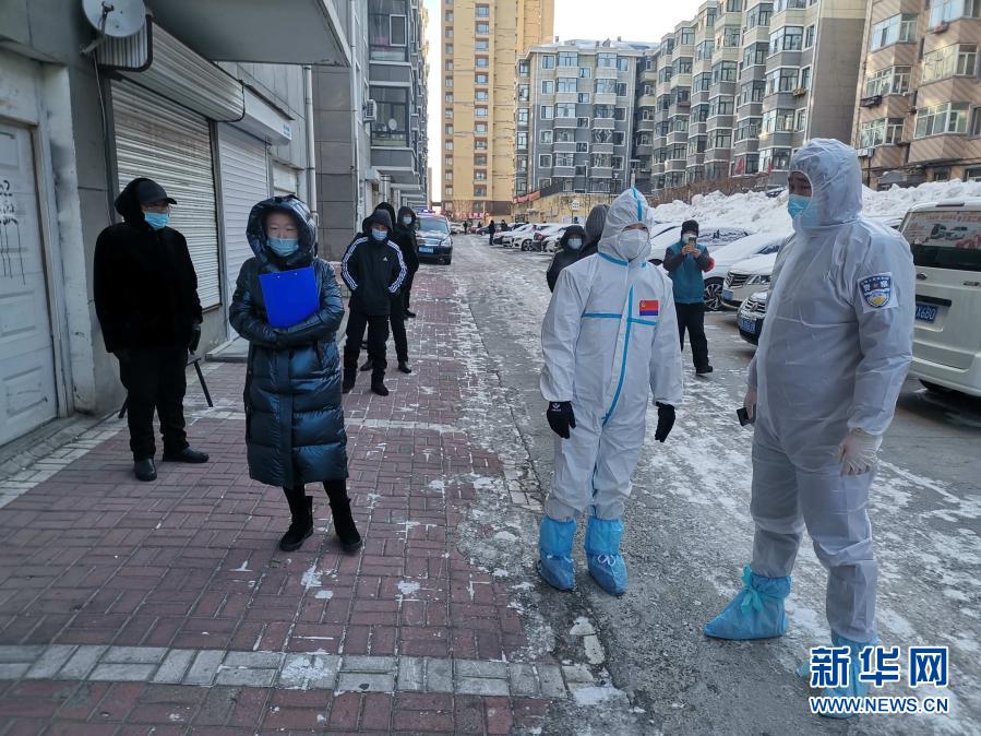 1月27日,呼兰区第三次全民核酸检测,史广雨(右一)作为辖区机动组负责人到生态园二期点位,协调解决现场遇到的问题。