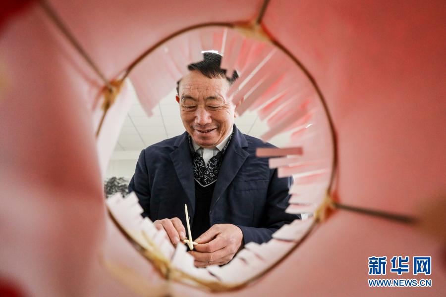 2月3日,杨绍书与孩子们一起做灯笼。