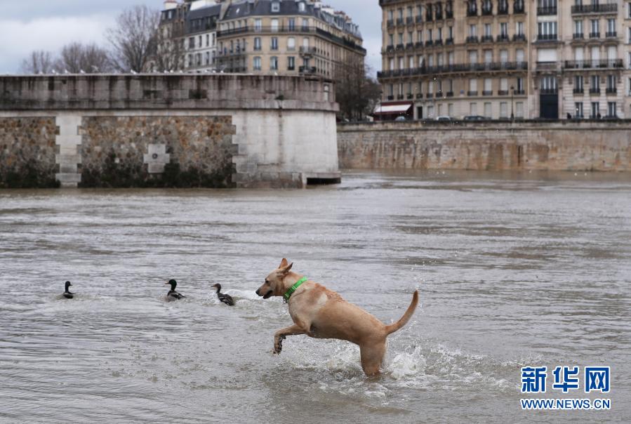 2月3日,一只小狗在法国巴黎塞纳河畔被水淹没的地区玩耍。